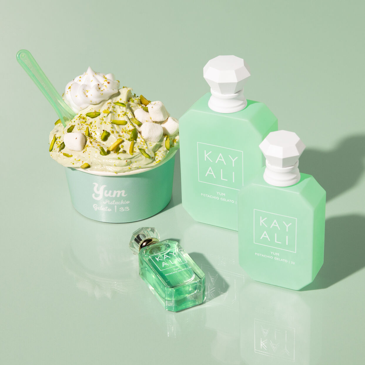 Yum Pistachio Gelato | 33 Eau de Parfum Intense is a delicious explosion of irresistible and edible notes including pistachio, voluptuous whipped cream, roasted hazelnut, sweet rum, fluffy marshmallow, and fizzy cotton candy. A truly yummy fragrance that charms with an unforgettably intense, gourmand scent trail that will have you smelling good enough to eat.